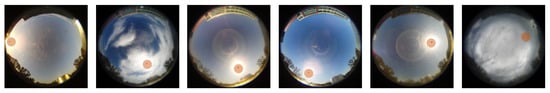 After calculating the position of the sun’s center in the image, we generate the SunMask and append it as a fourth channel to the RGB image. The SunMask consists of a mask around the center of the sun with a pixel value of 255, while the rest of the pixels have a value of 0. In Figure 7, we showcase the results of our image processing method for indicative images, with the SunMask portrayed in orange. It can be observed that the proposed sun localization method accurately identifies the position of the sun in all the images, regardless of their variations in terms of the solar azimuth angle, zenith angle, and cloud coverage of the sun.