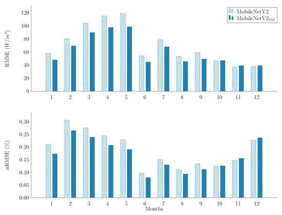 In order to quantify the effect that the SunMask generation method has on different distributions of sky image phenomena, we evaluated the MobileNetV2 model, which shows the largest improvement with the SunMask, on individual months. The RMSE and nRMSE results are presented in Figure 9. We note here that we focus on the nRMSE metric in order to directly compare the performance of the models across different months. The reason for this is that the distribution of the sky image features and irradiance values is different for each month. Thus, a month with a smaller RMSE can correspond to a larger nRMSE, and vice versa; this is apparent in months such as February, May, and December. The nRMSE plot indicates that, in general, the model tends to perform better in months when there are less complex effects of clouds obstructing the sun in the image, such as June and August. Furthermore, the improvement in the performance thanks to SunMask is larger in months with complex sky image phenomena. In particular, MobileNetV2 shows the largest nRMSE improvement with SunMask in February (4.1%), May (3.9%), March (3.7%), April (3.7%), and January (3.6%). The current work focuses on the dataset generated at the location of Folsom, CA, USA (, ). However, it would be worth exploring the performance of image regression CNNs for irradiance estimation and of the proposed SunMask generation method on other geographic areas. These geographic areas could include regions with significantly different sky image feature distributions, such as higher latitude regions where the sun is close to the horizon. Of course, this would require an extensive, publicly available, and high-quality dataset for the particular area. The availability of such extensive, annotated, and public datasets is currently an open issue in the field of Deep Learning-based irradiance forecasting and Machine Learning in general.