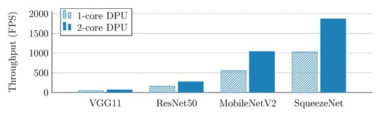 Throughput results for the four studied models on one and two processing cores of the DPU.