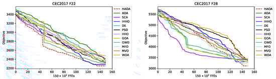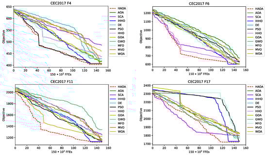 Therefore, the HAOA was validated on exceedingly challenging global optimization benchmark functions from the CEC2017 testing suite [123] with 30 parameters. The total number of instances is 30, and they are divided into 4 groups: from to —uni-modal, from to —multi-modal, hybrid functions are instances from to , and finally, the most challenging functions are the composite ones that include instances from to . The composite benchmarks exhibit all characteristics of the previous 3 groups; plus, they have been rotated and shifted.