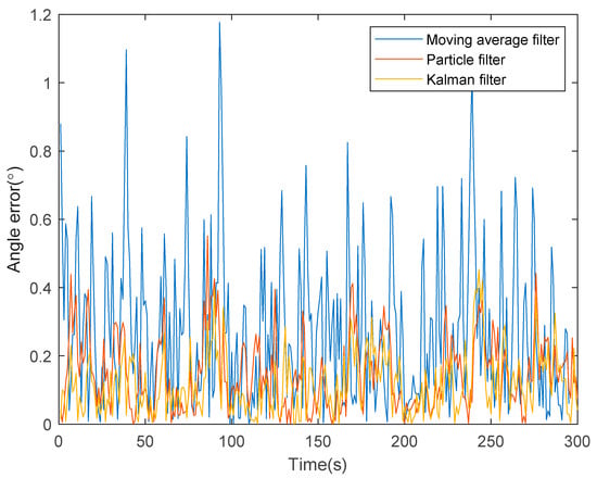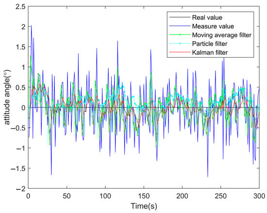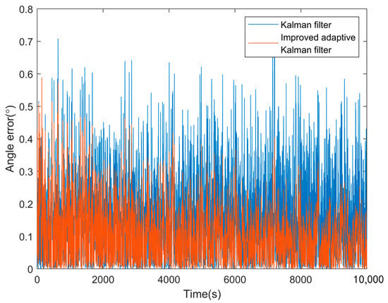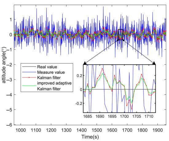 We can see that the filtering effect of the IAKF and KF is relatively close in the time range of 0–100 s. This is because the forgetting factor S did not play a considerable role at the beginning of the simulation, and the Q and R of the noise adaptive system are not further adjusted. After a period of simulation, it can be clearly seen that the data filtered by the IAKF are closer to the real value, and the error of IAKF becomes smaller and smaller, but the error of the KF algorithm is still in a state of random fluctuation. It can be seen that the IAKF plays a greater role in the acquisition of angle data.