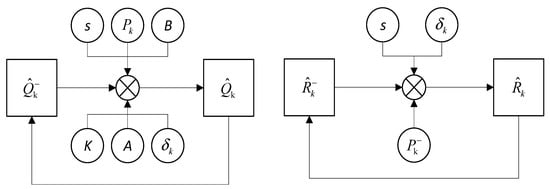 Although, in the above simulation results, the Kalman filter played a certain filtering effect, it can be seen from the simulation results that, when the measured data fluctuates greatly, the Kalman filter still has a large error. The Kalman filter needs to know the determined system noise covariance Q and measurement noise covariance R first. The accuracy of noise acquisition has a great relationship with the filtering results. In the actual system, it is difficult to know the exact Q and R values due to the complexity of the field environment, which makes the filtering result less accurate. Therefore, this paper decided to use the Sage–Husa adaptive Kalman filter. The Sage–Husa adaptive Kalman filter enhances noise adaptation. While using the observation data for recursive filtering, the forgetting factor is used to continuously estimate and correct the inaccurate parameters of the model and the noise covariance matrix. In this way, it can adapt to the interference of the environment and the time variations in the filtering process. This method can improve filtering accuracy and reduce state estimation errors, achieving a good filtering effect. The principle of the Sage–Husa adaptive Kalman filter algorithm is shown in Figure 8.