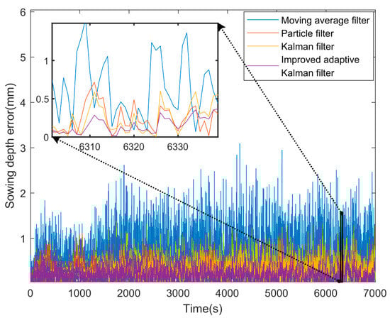 The experiment started from the position at which the sowing depth was 0 mm by controlling the Electric Servo Cylinder with the microcontroller. We set the Electric Servo Cylinder to extend downward at a constant speed from a predetermined speed. This allowed the sowing depth to vary until the predetermined depth of 7 cm was reached. At the same time, percussion vibration was artificially applied to the sowing monomer during the measurement. In the experiment, the sensor was disturbed by manually using a small hammer to knock on it, and the sowing monomer vibrated from bottom to top. The sowing depth was measured and calculated by the sensor. The experimental site for sowing the monomer is shown in Figure 13. The variation of the error of the experimental results is shown in Figure 14. The MSE of sowing depth measurement is shown in Table 2. It can be seen from the figure that the data acquisition error becomes larger when noise is artificially applied to the sowing monomer. This is mainly due to the impact the shock has on the accelerometer. It can be seen in the figure that the error curve represented by the MAF, PF, KF, and other algorithms increases with the changes in vibration and cannot be optimized with time, while the error curve of the IAKF algorithm has a large error in the initial state. However, over time, the adaptability to noise becomes stronger and the error lowers. It can be seen that the IAKF algorithm can still achieve a good accuracy in the actual scene and successfully improves the detection ability of the sowing depth.