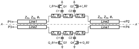 In this article, the quadrature hybrid coupler with digitally reconfigurable I/Q phase is proposed. The circuit schematic diagram is shown in Figure 1, which consists of coupled transmission lines, un-coupled line sections, and switched capacitors. In the un-coupled line sections, one node of the binary weighted capacitors C1/C2 is parallel connected to the I/Q path, and the other node of C1/C2 is connected to the NMOS transistors Q1–4, which are switched on/off by the control voltages I_B1, I_B2, Q_B1, and Q_B2.