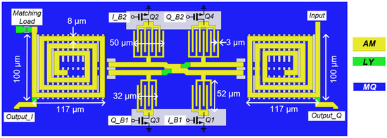 Finally, the compact quadrature coupler is implemented with 130 nm SiGe BiCMOS process. The isolation port is connected with an on-chip 50 Ohm resistor (as the matching load). The chip core area is 460 µm × 151 µm, or 0.031λ0 × 0.011λ0, which is ultra-compact, as shown in Figure 5.