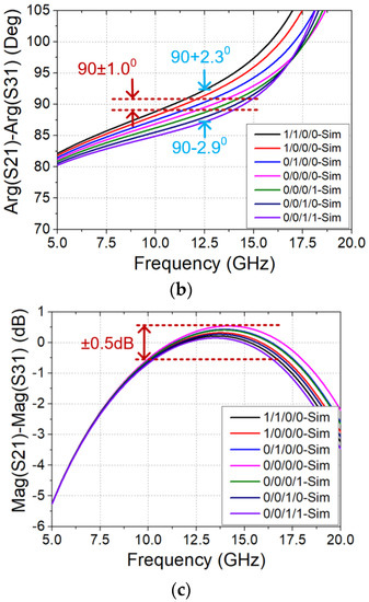 Figure 4b,c show the phase and magnitude difference between the S21 and the S31 for all phase-configuration states. It is noted that although there are 16 combinations for the four control bits (I_B2/I_B1/Q_B2/Q_B1), not all of the combinations are valid. For example, the combination 0/1/0/1 means both the I-path C1 and the Q-path C1 are connected to the transmission line when the transistors Q1 and Q3 are switched on. In this case, the phase offset configuration for the I-path and Q-path are canceled with each other. Thus, I_B2/I_B1/Q_B2/Q_B1 need to be grouped as two control bits for the I-path and two control bits for the Q-path, which corresponds to seven valid phase-configuration states, including the initial 0/0/0/0 state (all switches at OFF).