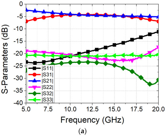 Figure 4 shows the simulated results of the compact quadrature coupler with a digitally reconfigurable I/Q phase. Figure 4a shows the S-parameter of the transmission (S21), coupling (S31), and isolation (S32), when the digital control-bits I_B2/I_B1/Q_B2/Q_B1 are 0/0/0/0 (all switches at OFF). S11, S22, and S33 are the return loss for each port. For 10~15 GHz, the simulated magnitude difference between the S21 and S31 is less than ±0.5 dB, the isolation and the return loss for each port is better than −17.5 dB.