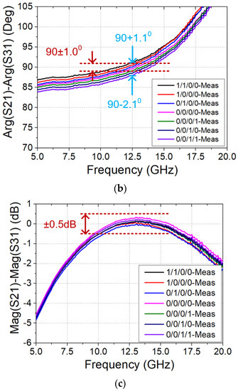 For 10~15 GHz, the phase difference between the S21 and S31 is 90 ± 3.0° for the initial 0/0/0/0 state. With all the seven phase-configuration states, the phase difference can be improved to 90 ± 1.0° for 10~15 GHz, with each configuration state covering a small sub-band, as shown in Figure 4b. Meanwhile, for the frequency at 12.5 GHz, the phase can be reconfigured from 90 − 2.9° to 90 + 2.3° with the seven phase-configuration states, which can be used to compensate the I/Q imbalance existing in other parts of the quadrature circuit, like in the I/Q mixer. For the seven phase-configuration states, the impact on the magnitude difference between the S21 and S31 is quite small and keeps within ±0.5 dB, as shown in Figure 4c.