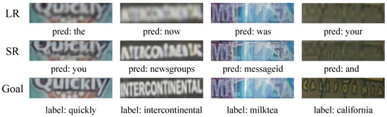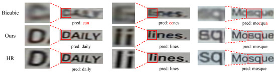 Today, information in images is essential in various situations, including daily life, business scenes, and medical settings. However, the information is often lost due to several factors, such as complex backgrounds, noise, blurriness, and low-resolution images. In recent years, there have been many studies to obtain high visual quality images without noise, including approaches in bio-imaging [1,2] using a scientific camera such as CMOS and approaches using super-resolution (SR) processing [3,4,5,6]. In scene text recognition (STR) which we address in this study, the visual quality of images is also an important factor because recognition performance is significantly affected by them. STR aims to convert text images into computer-readable and editable symbols, a fundamental and vital task in computer vision. This technique has been widely applied to studies for automation or efficiency, such as license plate recognition, text retrieval, and ID card recognition [7,8,9]. The performance of STR has improved significantly in recent years with the development of deep learning. However, images with various quality degradations, such as low resolution (LR) or blurred structures, cause significant difficulties in text recognition. Against this background, recently, there have been many studies to improve the resolution and visual quality of text images for STR.