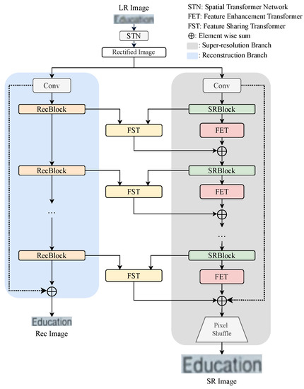 The overall architecture of our proposed MTSR Network for STISR. FET and FSR stand for Feature Enhancement Transformer and Feature Sharing Transformer, respectively.