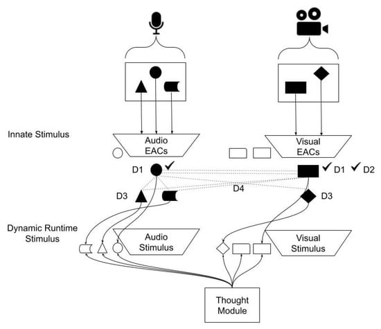Operation M5: Elementary activation characteristics (EACs) or innate stimulus vectors contain predefined, static low-order stimulus information for each modality. The purpose of EACs is not to pre-program the system with abstracted concepts of innate behavior—e.g., a desire to reproduce or an ability to avoid danger. Rather, EACs are meant to prime the system’s thoughts with stimulation toward certain input modality characteristics.