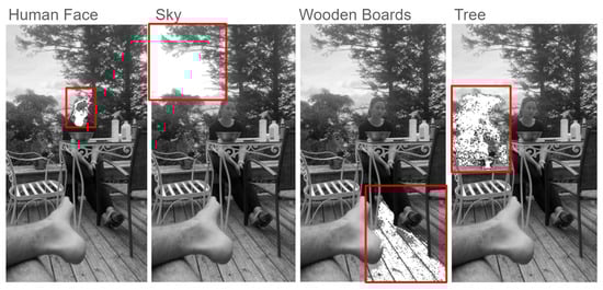An example of the feature output from the abstraction algorithm can be seen in Figure 5. The algorithm’s ability to identify distinct objects within a scene in an unsupervised and untrained manner is demonstrated. The algorithm output shown identifies a human face, the sky, wooden boards, and a tree. The identified objects are shown separately for visual effect, though all features within the image are captured by the system.