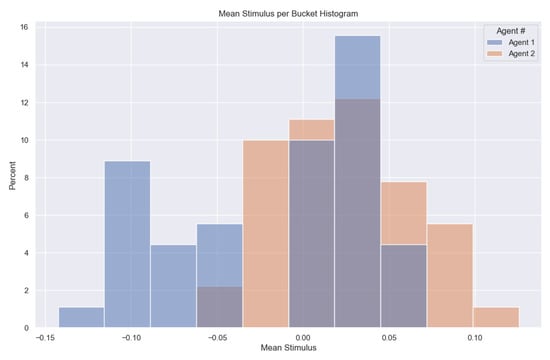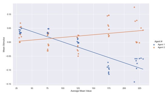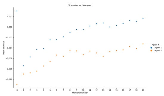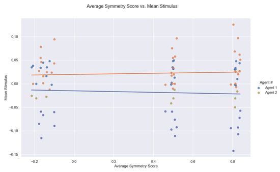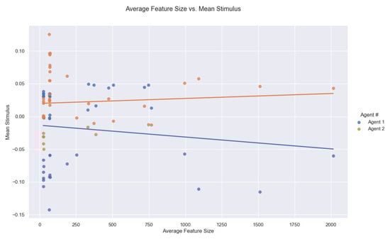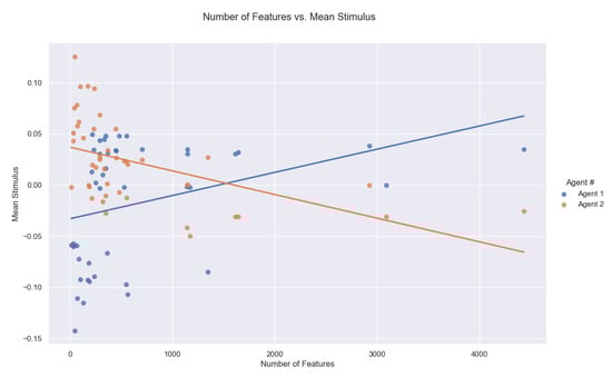 Figure 7, Figure 8, Figure 9, Figure 10 and Figure 11 reveal stimulus and attribute relationships at a memory index level. The plots compare the relationships between the system’s mean stimulus values and feature attributes in the memory tree for the two different agents. When comparing the number of features in memory indexes versus the mean stimulus of those features (Figure 7), Agent 1 generally experiences positive stimulus in memory areas with larger feature numbers, while Agent 2 experiences positive stimulus in memory areas with smaller numbers of features. In a full implementation, the cognitive processes of Agent 1 may favor environments with fewer discrete features, while Agent 2’s cognitive functions would be stimulated more in environments with many discrete features. In the case of average feature size per memory index versus mean stimulus (Figure 8), Agent 1 experiences on average more negative stimulus associated with larger feature sizes, while Agent 2 experiences on average more positive stimulus in memory areas with large feature sizes. The same reverse correlation between agent stimulus exists when analyzing the average mean power value and symmetry relationships with mean stimulus (Figure 9 and Figure 10). Overall, after both agents experience the same data, Agent 1’s stimulus is slightly negatively biased relative to Agent 2’s stimulus, which is more positively biased by its emulated environment (Figure 11).