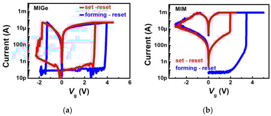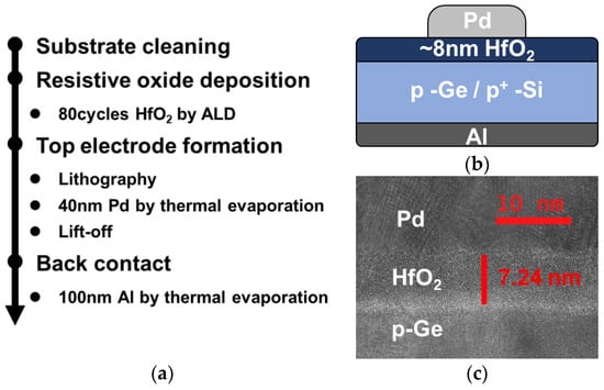 Two types of devices were fabricated, including MIS and MIM devices. For MIS devices, Pd/HfOx/p-Ge devices and Pd/HfOx/p+-Si devices were fabricated. The process flow is depicted in Figure 1a. After the wafer cleaning, 7 nm HfOx was deposited on Ge or Si substrates by Atomic Layer Deposition (ALD). The ozone post oxidation (OPO) is not processed here in contrast with the process of previous HfOx/Ge RRAM [21,22]. It is not only because the interface is vital for previous RRAM stack used in MOSFET, but the stack variable here needs to be the same as the one in MIM devices. Subsequently, the lithography process and Pd deposition were carried out, and a lift-off process was utilized to form the top electrode. Al was finally deposited using thermal evaporation as a contact metal to Ge or Si substrates. To distinguish the Ge-based and Si-based devices, hereinafter MIGe is used to refer Pd/HfOx/p-Ge devices, and MISi is used to refer Pd/HfOx/p+-Si devices. For MIM devices, a typical TiN/HfOx/Pt device was fabricated by the following process flow. First, back electrode Pt was sputtered on a SiO2 substrate. Next, 7 nm HfOx as the switching layer and 15 nm TiN as the top electrode were sequentially deposited by ALD. Afterward, the contact metal W was deposited by sputtering and patterned by lithography. Lastly, a W/TiN/HfOx stack was etched layer by layer using Inductive Coupled Plasma (ICP) tool to expose the bottom electrode.