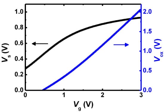 It is worth pointing out that the effective voltage drops on the oxide stack (Vox) of MIGe devices are less than the voltage applied on the gate/top electrode (Vg). There are two situations: (a) The MIGe device works like a MOS when it is at HRS due to the negligible CF; (b) When the MIGe device works at LRS, the CF is conductive, so the device is not equivalent to a MOS. In the case of HRS, the voltage on the gate contributes to a series of oxide capacitance (Cox) and substrate capacitance (Cs). The total capacitance (Ctot) is approximate to oxide capacitance at negative bias; thus, the voltage drop on the oxide stack is equal to Vg. While the device is positively biased, the surface potential, which is equal to the voltage dropped on the substrate (Vs), is extracted using a quasi-static technique [23,24]. The surface potential is expressed as Equation (1):