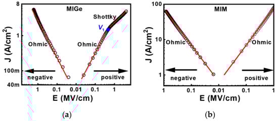 To further understand the conduction mechanisms of MIGe devices, double logarithmic J-E curves in LRS were plotted. As shown in Figure 4a, the fitting results suggest that two different conductive mechanisms exist for MIGe devices. When the applied voltage on the top electrode (TE) is less than V1, the conduction behavior is ohmic because ln(J) is proportional to ln(E), and the slope is around 1. When the voltage on the TE increases above V1, the slope of the curve reduces to smaller than 1. The current density vs. electric field data fits well with the Schottky emission equation in which ln(J) ∝ E1/2 [25]. Based on the Schottky emission equation, the barrier height ΦB is calculated to be 0.35 eV, while the electron effective mass in HfOx is approximated to be about 0.11 m0 [26]. The conductive current through CF is contributed by electrons, which are the minority carriers for MIGe devices. A comparatively low current through CF, especially at the moment of CF forming, could help limit the overgrowth of the CF region [27]. For MIM devices, the J-E curve is symmetric, as shown in Figure 4b, and the slopes are both around 1. Plenty of free electrons are available from the two metal electrodes leading to a high operating current.