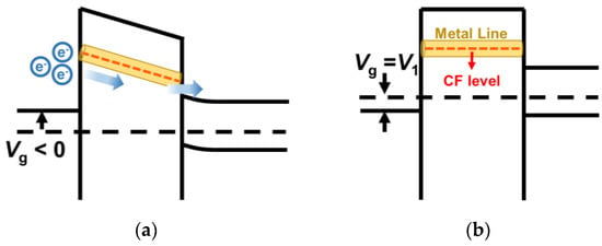 Figure 5 exhibits the energy band diagram for the illustration of electronic transport mechanisms when the MIGe device works at HRS. As shown in Figure 5d, the voltage drop, Vg, is divided between the oxide switching layer and Ge substrate. When negatively biased, the resistance of the Ge substrate is negligible, and the resistance of CF (RCF) can be extracted from I-Vg. Then the voltage dropped on the Ge substrate (Vs) could be derived as Vg–I*RCF, where I*RCF is approximately the voltage on the switching oxide (Vox). Therefore, Vg is almost equal to Vox when the device is negatively biased (Vg < 0). On the other hand, when Vg > V1, Vg is mostly distributed to Vs. As depicted in Figure 5b, the conductive filament consists of abundant oxygen vacancies (VO), which can gather to form a quasi-continuous defect energy band in the bandgap of HfOx [28]. In this case, the filament consisting of VO can be treated as a metallic conducting path between the TE and Ge substrate at negative biases (Figure 5a). However, when the Vg is positive and larger than V1, the electrons from the Ge substrate need to overcome an energy barrier of 0.35 eV to reach the defect levels of the CF (Figure 5c). From the experimental data, it is estimated that the energy level of CF is close to the conduction band minimum (CBM) of Ge and roughly 1.75 eV below the CBM of HfO2. This energy level is consistent with previous studies, which identified VO levels to be ranging from 1.2 to 2.1 eV below the CBM of HfO2 [29,30,31].