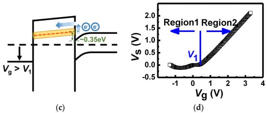 Energy band diagram of current transmission at (a) region 1, (b) region 2, (c) Vg = V1. (d) Vs-Vg curve. (Vs: the voltage dropped on Ge substrate; Vg: the voltage applied on the gate.).