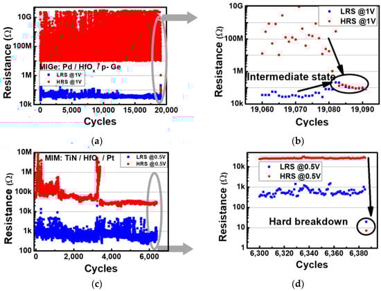 Furthermore, the DC endurance was characterized for Pd/HfOx/p-Ge, Pd/HfOx/p+-Si, and TiN/HfOx/Pt devices. The sequence of SET-READ-RESET-READ cycles was used, and devices with the same dimension (40 μm × 40 μm) were characterized. The cycling results of MIGe and MIM devices were plotted in Figure 6, which suggests different endurance failure phenomena of MIGe and MIM devices. For MIM devices, it can be observed that a sudden hard breakdown happened during the RESET, as shown in Figure 6d. Its endurance failure behavior is similar to those that originated from the depletion of O2− which induced the RESET difficulty and increased vacancy concentrations [19,32]. In contrast, the MIGe devices maintained a stable endurance window of 100× or more but failed when the HRS and LRS converged into an intermediate state, as shown in Figure 6a,b. Although the distribution of HRS appears to be wide on account of the randomness of oxygen ion movement, pulse programming is an effective approach to improve the uniformity of HRS [10]. Pulse characterizations were implemented further for MIGe and MIM devices (data not shown here). The results of pulse endurance are in correspondence with the results of DC endurance. The MIGe device is still functional after 105 fully successful switching cycles, whereas the MIM device broke down after 104 pulse switching cycles. The effective operation cycles of the MIGe device (>105) are sufficient for CIM [33] since the SET/RESET operations will not be executed frequently.