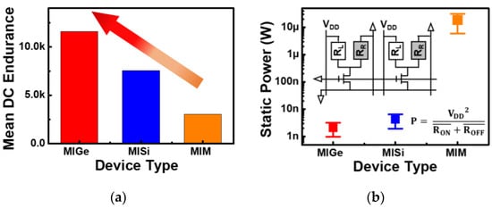 In addition to the larger and more stable memory window achieved by MIGe devices, it is also demonstrated that the devices have superior endurance over the other two types of devices. To further confirm the superior endurance performance of MIGe devices compared to MISi and MIM, DC endurance tests were further carried out for multiple devices of each sample. Figure 7a summarizes the mean DC endurance of MIGe, MISi, and MIM devices. The mean DC endurance of MIGe devices is around 104, while that of MIM devices is ten times smaller. Moreover, the static power of FPGA’s pull-up/pull-down resistors when implemented with RRAM was calculated [2]. For FPGA’s configuration memory, the 1T2R structure was widely investigated. In these two resistors, usually one is ON, and the other is OFF. Therefore, the static power mainly depends on the OFF state resistor. Figure 7b compares the static powers of MIGe, MISi, and MIM devices at a 1.8 V supply. The results suggest that MIGe RRAM is a promising candidate for FPGA’s pull-up/pull-down resistors.