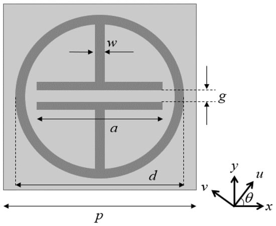 Recently, the beam steering and focusing techniques using the metasurface have been researched intensively [,,,,,]. In this paper, a novel design methodology of simultaneous beam forming and focusing by a rearrangement of anisotropic surface in the form of a checkerboard is proposed. Multibeam control regardless of far and near regions easily can be achieved through a structural rearrangement. A single-layer anisotropic surface is designed using an electric field coupled resonators (ELCRs) []. If a circularly polarized (CP) wave is incident on the unit cell of the surface, the transmitted phase variation of the unit cell is twice the rotation angle of the unit cell. In this paper, the source antenna has the operation frequency of 5.8 GHz and a right-handed (RH) CP characteristic. In the next section, the operation principle of the unit cell of the anisotropic surface is explained, and the full-wave simulated results are presented. The design procedure and measured results of the transmit array antenna for simultaneous beam forming and focusing are discussed in Section 3. In the final section, the concluding remarks are given.