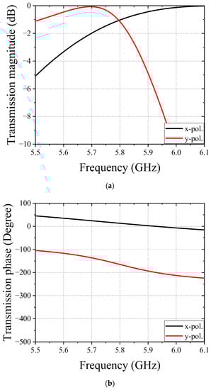 Full-wave simulated transmission responses of the unit cell of anisotropic surface. (a) Magnitude (b) Phase.
