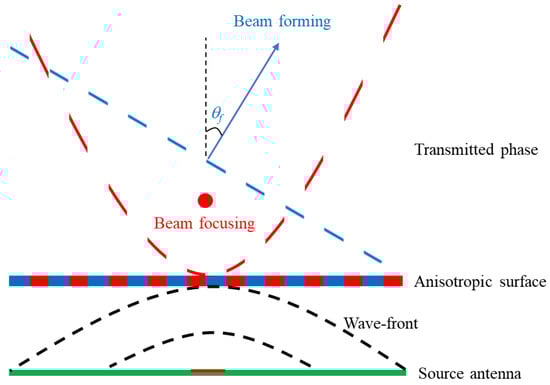 The beam forming angle can be decided if the phase differences (ϕ) are equal to the propagation induced phase delays, namely ϕ = βp × sinθf. Additionally, the beam focusing can be implemented using parabola formula. In order to realize the focal length (f), the phase of the transmitted wave should satisfy the following equation