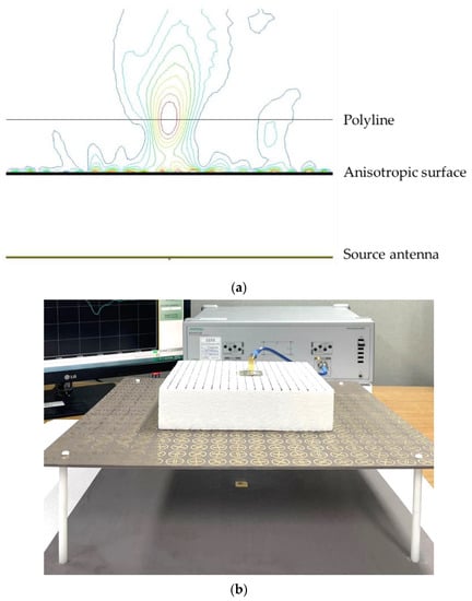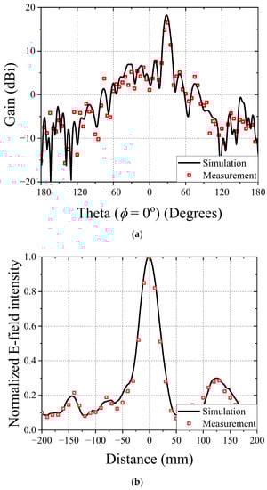The distance between source antenna and anisotropic surface is considered to be 100 mm (≈2λ0 at 5.8 GHz) considering optimized spillover and taper efficiencies. Thus, the overall dimension of the fabricated transmitarray antenna is 400 mm (Length) × 400 mm (Width) × 104.8 mm (Height). The forming angle and focal length are simulated to be 28 degrees and 64.8 mm having errors of about 7% and 8% by FEM simulator (ANSYS Electronics desktop software), respectively. The simulated electric field intensity is obtained along the x-axis at focal length of 64.8 mm, as shown in Figure 6a. Additionally, to measure the electric field intensity, the receiving LHCP patch antenna is placed on the Styrofoam and S21 is measured on the x-axis (z = 64 mm) at intervals of 10 mm, as shown in Figure 6b. Additionally, the measured far-field radiation pattern is obtained using the semi-anechoic chamber system. The semi-anechoic chamber can suppress the multiple reflections using three 18-inch pyramidal absorbers and the time gating process of the vector network analyzer. As shown in Figure 7, the measured results agree well with the analytic and the full-wave simulated results. A slight difference between analytic and measured results is caused by the finite dimension of anisotropic surface and relatively large unit cell for the wavelength.
