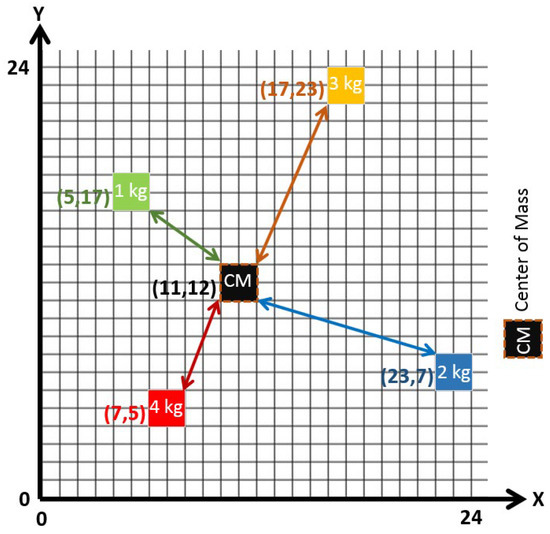 In other words, to calculate the center of mass of several points in a space with the desired number of dimensions (even more than three dimensions), Equation (2) is sufficient. Figure 2 illustrates the center of mass (CM) for four hypothetical points with different masses in a two-dimensional space. In this figure, Equation (2) calculates the center-of-mass value for each dimension. In addition to the applications of the center of mass in physical and mechanical sciences, this concept offers many applications in other fields, such as the manufacturing of medical equipment, the design of sports equipment, and improvements in daily life [32,33].