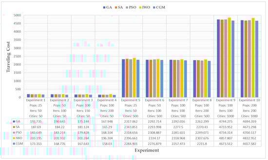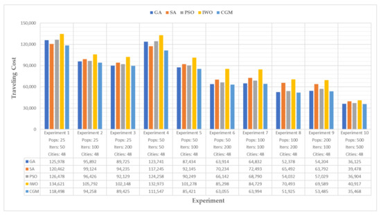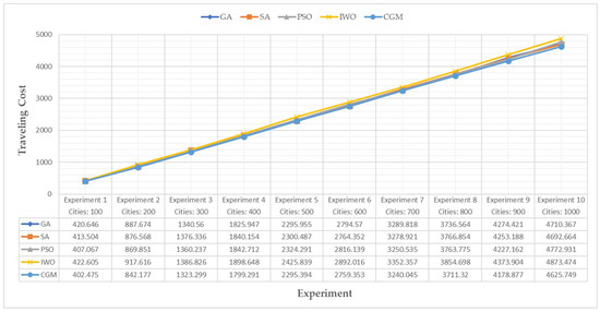 Figure 13 shows that on average, in all experiments, and for different problem sizes, the CGM method was able to improve the distance by 0.03% compared with the best solutions and by 13.44% compared with the worst solutions of other methods. Figure 14 also shows that on average, in all experiments, and for different problem sizes, the CGM method was able to improve the travel cost by 1.08% compared with the best solutions and by 4.94% compared with the worst solutions of other methods. Figure 15 also shows that on average, in all experiments, and for different problem sizes, the CGM method was able to improve the distance by 2.61% compared with the best solutions and by 16% compared with the worst solutions of other methods. As a result, it can be said that the CGM method has better scalability.