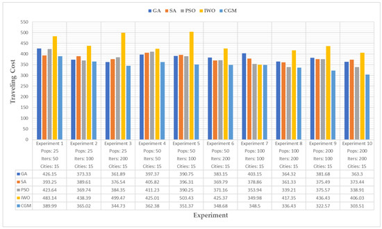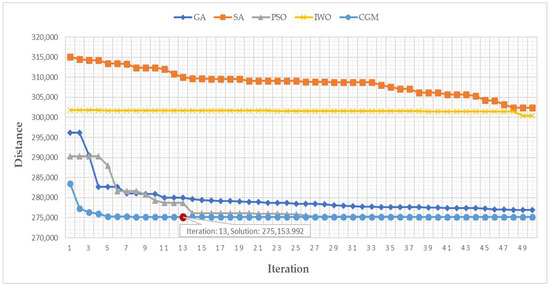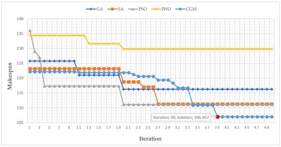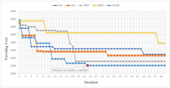 The results presented in Figure 10 for the optimal-placement-of-resources problem show that the CGM method was able to converge to the minimum distance by the 13th iteration. Among other benchmark algorithms, the PSO algorithm could converge to the same result by the 27th iteration, and the others could not achieve this value until the end of 50 iterations. The results presented in Figure 11 for the traveling salesman problem indicate that the CGM mechanism could converge to the minimum traveling cost by the 24th iteration. However, other benchmark algorithms could not converge to this value until the end of 50 iterations. In addition, the results presented in Figure 12 for the BoT scheduling problem also demonstrate that the CGM method could converge to the minimum makespan by the 39th iteration. However, other benchmark algorithms could not achieve this solution until the end of all iterations. The same result was obtained in cases with a larger number of members.