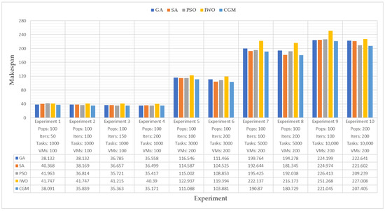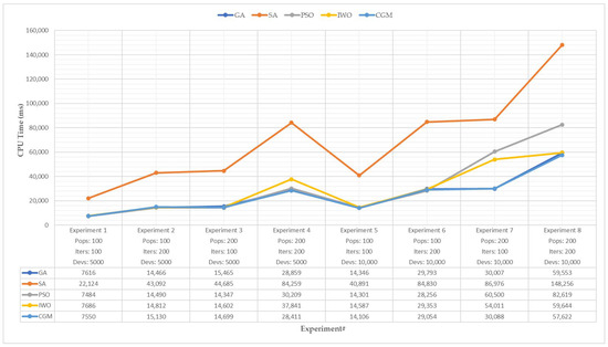Assuming that the number of population members and the number of iterations of the algorithm are kept constant, if the size of the problem increases, the CGM mechanism has acceptable scalability compared with other algorithms. In order to evaluate the scalability of the proposed method in terms of the optimal solution value, several experiments were performed with a wide range of different problem sizes. The results of these experiments can be seen in Figure 13, Figure 14 and Figure 15. In all three figures, the number of members of the population was 20, and the number of iterations was 100.