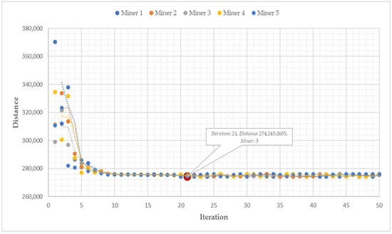 Collaboration of miners to determine the appropriate solution for the traveling salesman problem in the entire search space (the number of cities was 500).