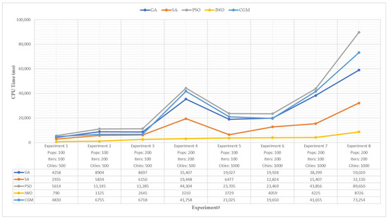 Evaluation results of execution time (CPU time) criterion for the traveling salesman problem with large parameters (in milliseconds).