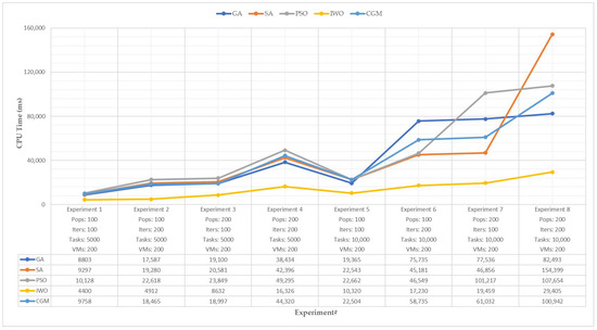 Another criterion that can affect the performance of an optimization algorithm is execution time. Generally, the execution time is calculated from the moment the algorithm starts until the end of all iterations. The CGM mechanism is able to find the optimal solution for mathematical functions and continuous practical problems in the shortest possible time. Figure 19, Figure 20 and Figure 21 illustrate this metric for the optimal-placement-of-resources problem, the traveling salesman problem, and the BoT scheduling problem, respectively. As can be seen in these figures, the computational demand of the CGM method for continuous practical problems is acceptable compared with other methods.