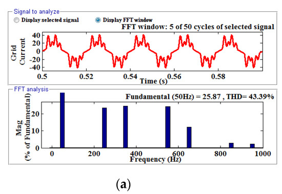 In this section, the grid−connected AC/DC MG is used with a nonlinear inductive load without any filtering. The non-linear properties of the load are found to cause the load current to be distorted, and the calculated THD is 17.06%. Figure 4a,b demonstrates, respectively, the harmonic analysis of the PCC voltage and the distorted load current.