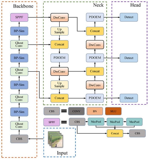 In Figure 1, the images are input into the backbone network, and feature extraction and slicing are first performed using ordinary convolution, and then the processed images are input into GhostConv and BP-Sim structures, and the feature images after the above operations are divided into multiple levels and passed to the Neck for concat operation. In the Neck structure, the feature information is extracted using depth-separable convolution, then the feature map is resized after upsampling and connected with the feature information of the backbone part, and finally the feature map obtained from the concat operation is input to the PDOEM module for information mining.