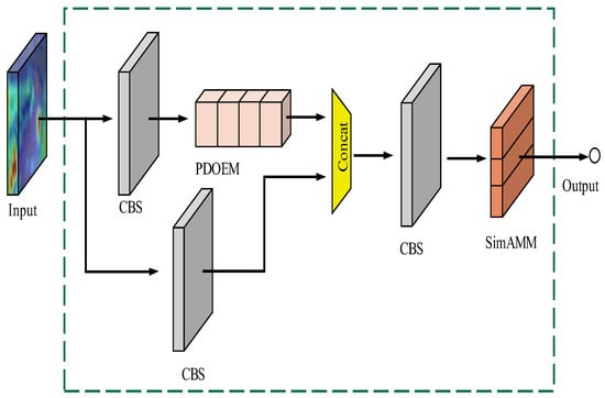 In Figure 3, the feature image first goes through traditional convolution to obtain one input edge of concat operation; in the other input, the feature map is extracted using traditional convolution, and while going through PDOEM for dimensionality reduction and enhancement, difficult feature information mining is performed with the help of the attention mechanism in this module, and the obtained feature information is connected with another edge of the feature extraction; finally, the connected feature map is extracted and information is mined again.