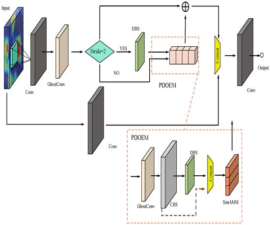 As the baseline network uses more common convolutional modules, and the traditional convolutional modules are large in size and have a large number of parameters. Therefore, we modified the backbone part of the baseline model and replaced the general convolutional module in the backbone with the GhostConv module, which reduces the number of parameters of the model with little reduction in accuracy. Inspired by this idea, we also replaced the basic convolutional module in the neck network with GhostConv, but the training results were not very good. In response to the experimental results, we considered that the model also needs to capture useful feature information and suppress noise information when performing feature fusion, so we kept part of the general convolution in the Neck network and replaced the original convolution module with the depth separable convolution, and connected SimAM after the DBS convolution module, and finally built the PDOEM feature fusion module, as shown in Figure 4 We use the PDOEM module to replace some of the normal convolutional modules in the Neck part in order to improve the situation of the inadequate extraction of high-level feature information and waste of computational resources when the network is fused with features, and because the addition of the attention module does not use too many computational resources, it is important for the model compression design and overall performance improvement.
