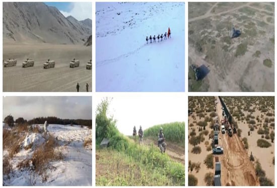 Due to the confidentiality of the information involved in the field, the image information related to border patrol is relatively scarce, so this paper creates the BDP dataset by offline collection, online collection of public video information, and network images. The BDP dataset has a total of more than 2600 samples, containing a total number of 11,000 labeled boxes, involving different tasks, different natural scenes of pedestrians, soldiers on duty, vehicles, camouflage vehicles, trucks and other common objects at the border. Some of the sample images of the dataset are shown in Figure 5. Due to the various methods of data collection, involving aerial photography, overhead cameras and some portable photographic devices, the dataset has various scales and complex image backgrounds, and some of the model objects are obscured, blurred, and individual features are difficult to be extracted completely. We normalized the dataset and then used the image annotation software LabelImg for annotation. The dataset is divided into the training set, test set and validation set in the ratio of 8:1: 1 for training and performance testing of the model.