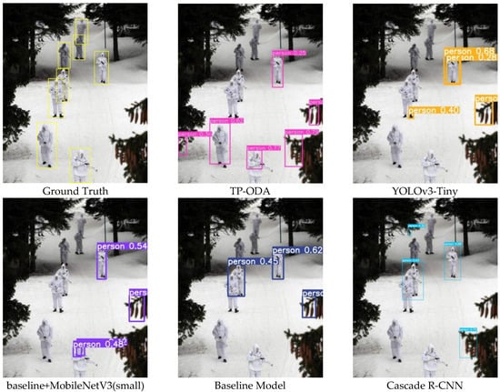 The detected environment in Figure 6 is a snowy scene, and the detected objects have a high similarity to the detection background, which is very challenging for the model. From the results, it can be seen that all the detections have missed and false detections. The Cascade R-CNN algorithm and the TP-ODA algorithm both detect three objects, and the benchmark model detects two objects, but also three object false detections, and the Cascade R-CNN only has one object. The experimental results show that the improved algorithm in this chapter is slightly less accurate than the Cascade R-CNN and better than the benchmark algorithm and other detection algorithms on this class of object detection task.