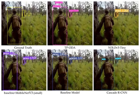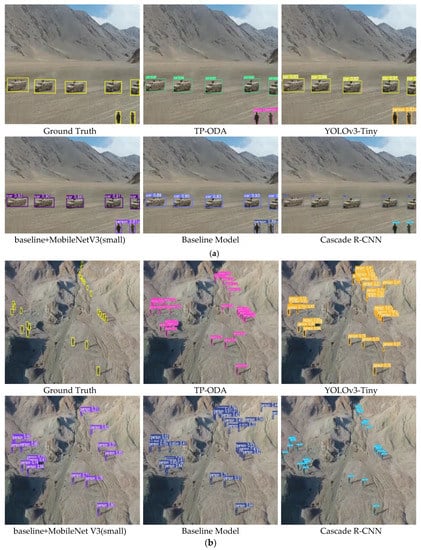 Figure 7 shows two sets of detected objects against a desert background, involving detection categories of soldiers and vehicles on duty. The main characteristics of this group of images are the large number of objects and the small size of the objects. From the results of the two sets of experiments, it can be concluded that all the detection algorithms can detect the vehicle objects and the algorithms have good overall performance, but when detecting pedestrian objects in this type of scene, the YOLOv3-Tiny and Baseline+MobileNetV3 detection algorithms show different degrees of missed detection, and the baseline model and TP-ODA show false detection, with the baseline. The Cascade R-CNN detection algorithm does not show false detections or missed detections, but the TP-ODA algorithm has a higher confidence value in the detection results, which is closer to the real frame.