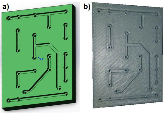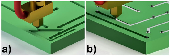 In the first stage of electrical circuit fabrication, an ABS substrate was printed on a standard FDM printer along with grooves (2 mm in width and height, respectively) for metallic conductive paths and holes for THT (through-hole technology) component leads (Figure 7). The preparation of the conductive paths and assembly of the THT elements took place in one process by filling the grooves with solder alloy using an aluminum nozzle and hot air soldering iron. The surface of the grooves was thoroughly cleaned with an organic solvent, and the soldering flux was applied only on the leads of the electronic components.