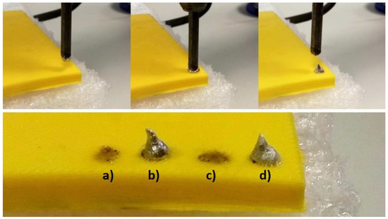 Results of adhesion tests of solder alloys on an ABS surface: (a) Sn60Pb40 with flux; (b) Sn60Pb40 without flux; (c) Sn99Ag0.3Cu0.7 with flux; (d) Sn99Ag0.3Cu0.7 without flux.