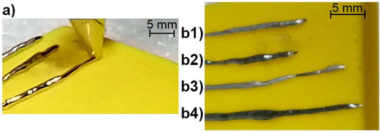 After rejecting the flux-containing solder wires, attempts were made to fabricate a long metal path on a polymer substrate. The alloys were deposited using a specially designed cone-shaped aluminum nozzle heated with a soldering iron or hot air to increase the homogeneity of the fabricated paths. The solder alloy is melted in the nozzle and freely deposited on the polymer substrate (Figure 3). The operating temperature of the soldering iron for both solder alloys (Sn60Pb40 and Sn99Ag0.3Cu0.7) is 285 °C. The research results confirmed the possibility of the additive application of solder alloys as conductive paths on a polymer substrate. The study also shows that the Sn60Pb40 solder is less viscous, possibly allowing for the deposit of longer paths.