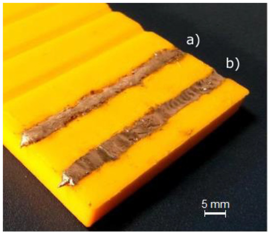 Conductive paths obtained using aluminum nozzle by filling grooves in ABS substrate with (a) Sn99Ag0.3Cu0.7 and (b) Sn60Pb40 solder alloy.