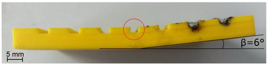 During the study, it was noted that a single application of a liquid solder alloy on the ABS surface shows no significant effect on the properties of the plastic at the application point, as the required melting points of the alloys are lower than the melting point of the ABS plastic. The same phenomenon was observed in our previous studies, where we successfully obtained conductive paths with laser-sintered silver paths on polymer substrates [67]. However, after making paths in the same groove several times, a bending of the substrate was observed at the solder alloy application place (Figure 5). The high temperature of the fused solder can negatively affect the polymer substrate if the deposition speed is too slow or the process is repeated several times. This is due to the thermal shock resulting from the temperature gradient between the upper (heated) and bottom (non-heated) parts of the 3D printed substrate. The solution for such a problem can be a heated table or heated chamber of the 3D printer. The angle of the bending increases with the subsequent application of liquid solder.
