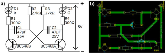 The symmetrical astable multivibrator circuit based on bipolar junction transistors (BJT) was fabricated to demonstrate the possibility of simultaneous production of conductive tracks and through-hole mountings with this additive method. While research has shown that it is possible to fabricate conductive metallic paths using the proposed FDMm technology on polymer substrates to make a fully functional electrical circuit, it is also necessary to perform the assembly of electronic components. For this purpose, the design of a multivibrator circuit containing electronic components, such as resistors, capacitors, transistors, and LEDs, was created. The circuit design was created in CAE (computer-aided engineering) software (Figure 6). The width of the conductive paths was set to 2 mm to 3D print grooves in the polymer substrate efficiently.