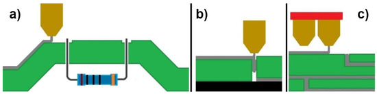 Research should be continued to develop the deposition method of solder alloys on complex, three-dimensionally shaped polymer substrates (Figure 9a). It is necessary to investigate the possibility of depositing solders on sloping surfaces while maintaining their high quality and adhesion to the substrate. Another example of the direction of development in circuit manufacturing is double and multilayer electrical boards. In the case of double-layer circuits, it is necessary to study the possibility of filling the vias with solder alloy (Figure 9b). In the case of multilayer circuits, apart from the necessity to produce vias with solder, it is also necessary to develop appropriate printing parameters, which differ significantly in the case of polymer and solder deposition (Figure 9c).