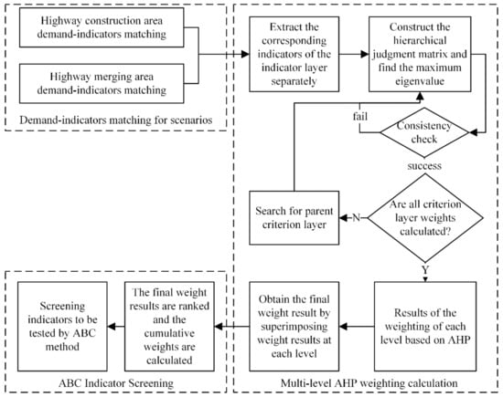 In this paper, the AHP method was used to construct judgment matrices for the highway’s construction area stress test and merging area strength test layer by layer; the eigenvectors of each judgment matrix were obtained in order to find the weight results of each layer and the final weight results of each index. Finally, according to the final weighting results classifying the ABC method for key index screening, we obtained the indicators to be tested for different scenarios of the IVIS system under closed conditions. The framework of this proposed method is shown in Figure 2.
